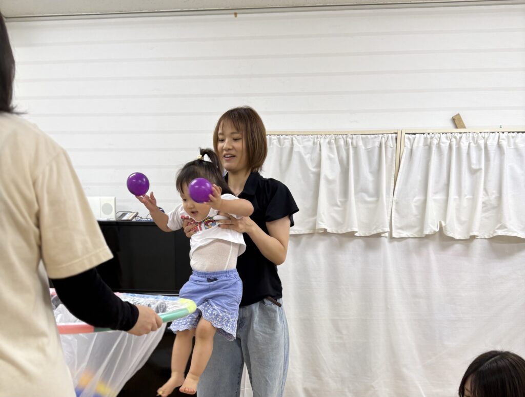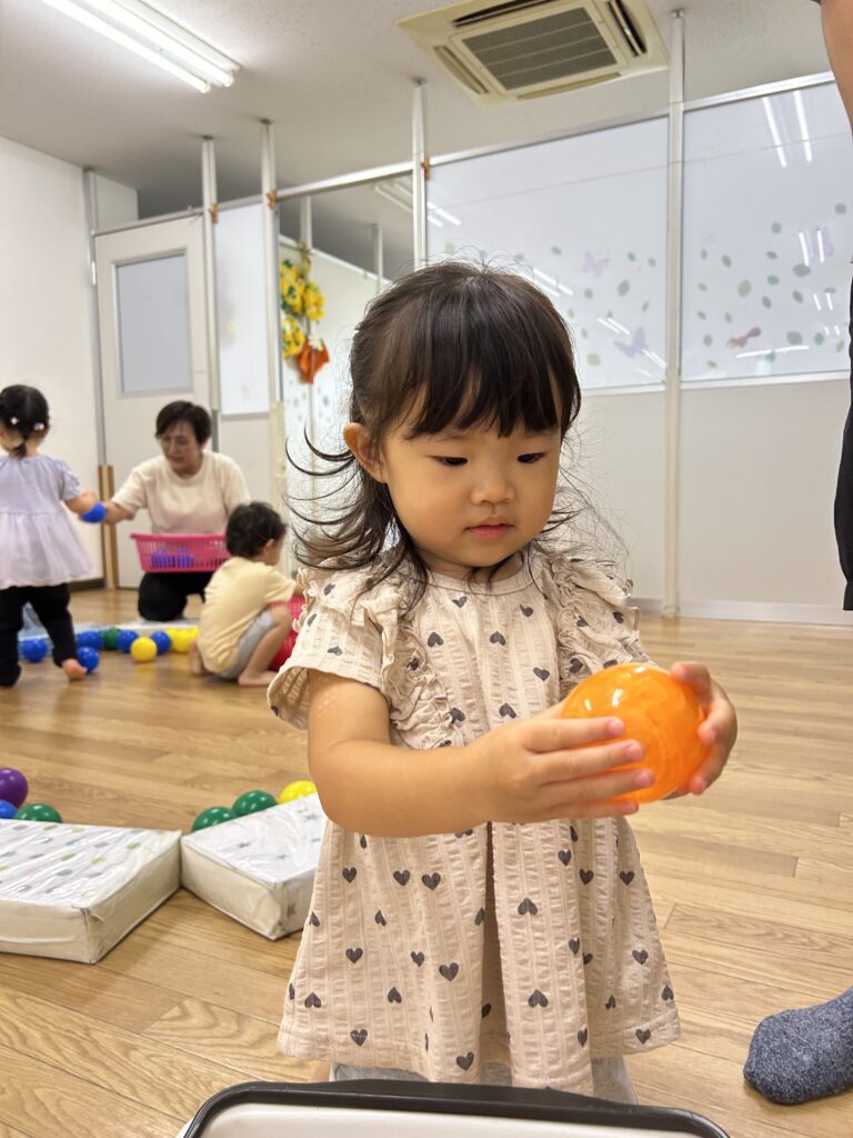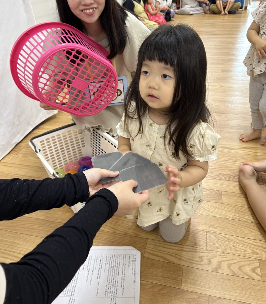 入れ物がくるくる回るので少し難しかったですが、保護者の方に協力してもらい、